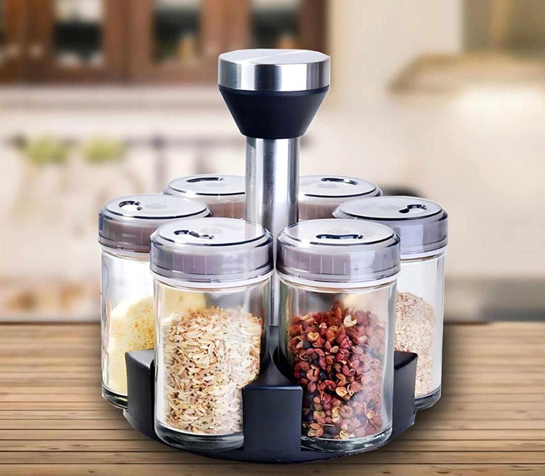 Añade elegancia y funcionalidad a tu cocina con este práctico organizador de especias. Consta de 6 frascos fabricados con materiales de alta calidad, que garantizan una gran durabilidad y son fáciles de limpiar. 👩🏻🍳 Cada recipiente está equipado con una tapa giratoria con 3 posiciones ajustables, lo que te permite controlar el flujo de especias, desde avena en hojuelas hasta granos finos como sal o orégano. Su diseño giratorio te ofrece acceso rápido y cómodo a cada frasco, optimizando el espacio de tu cocina y manteniéndola ordenada.