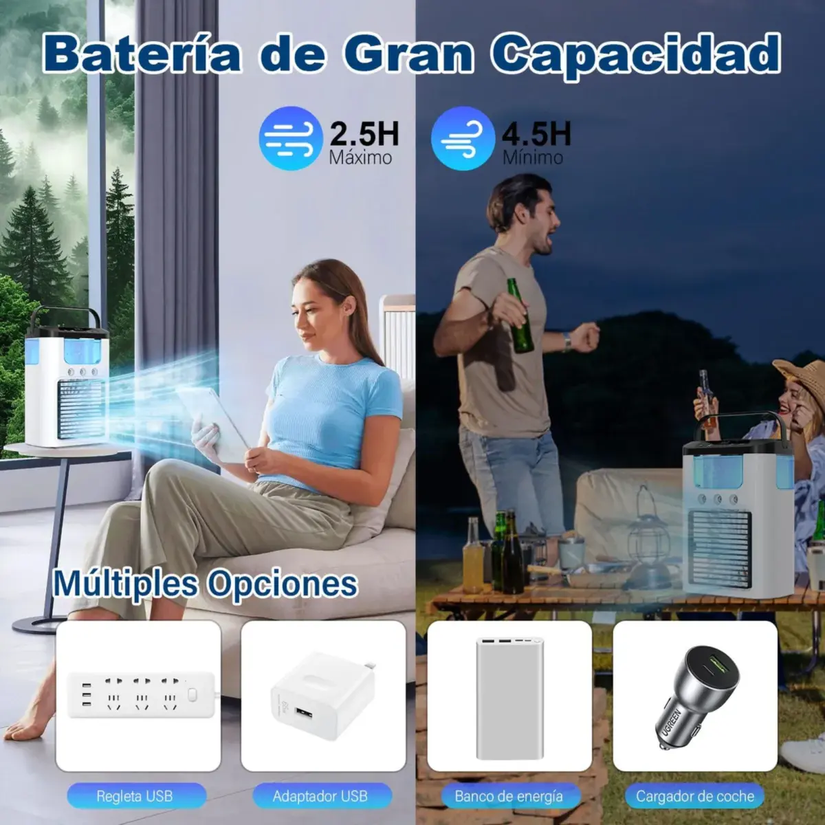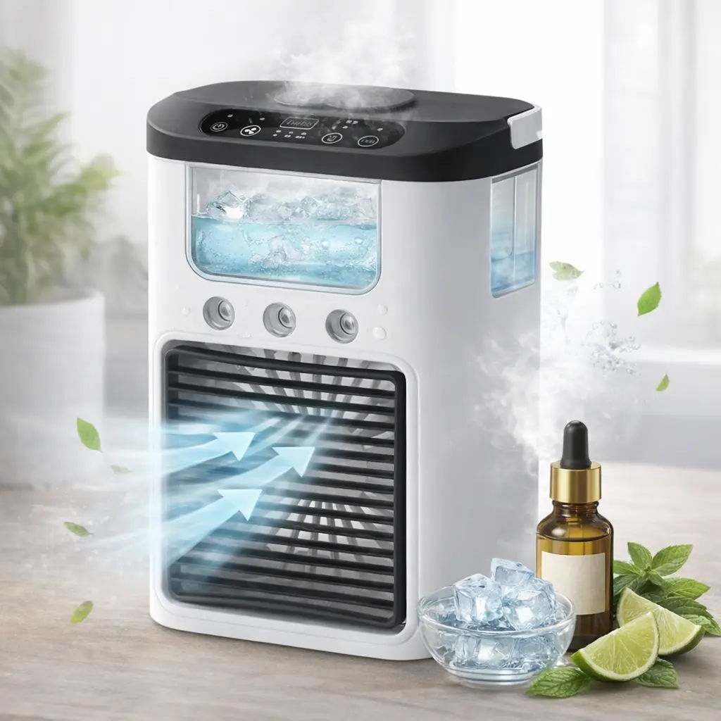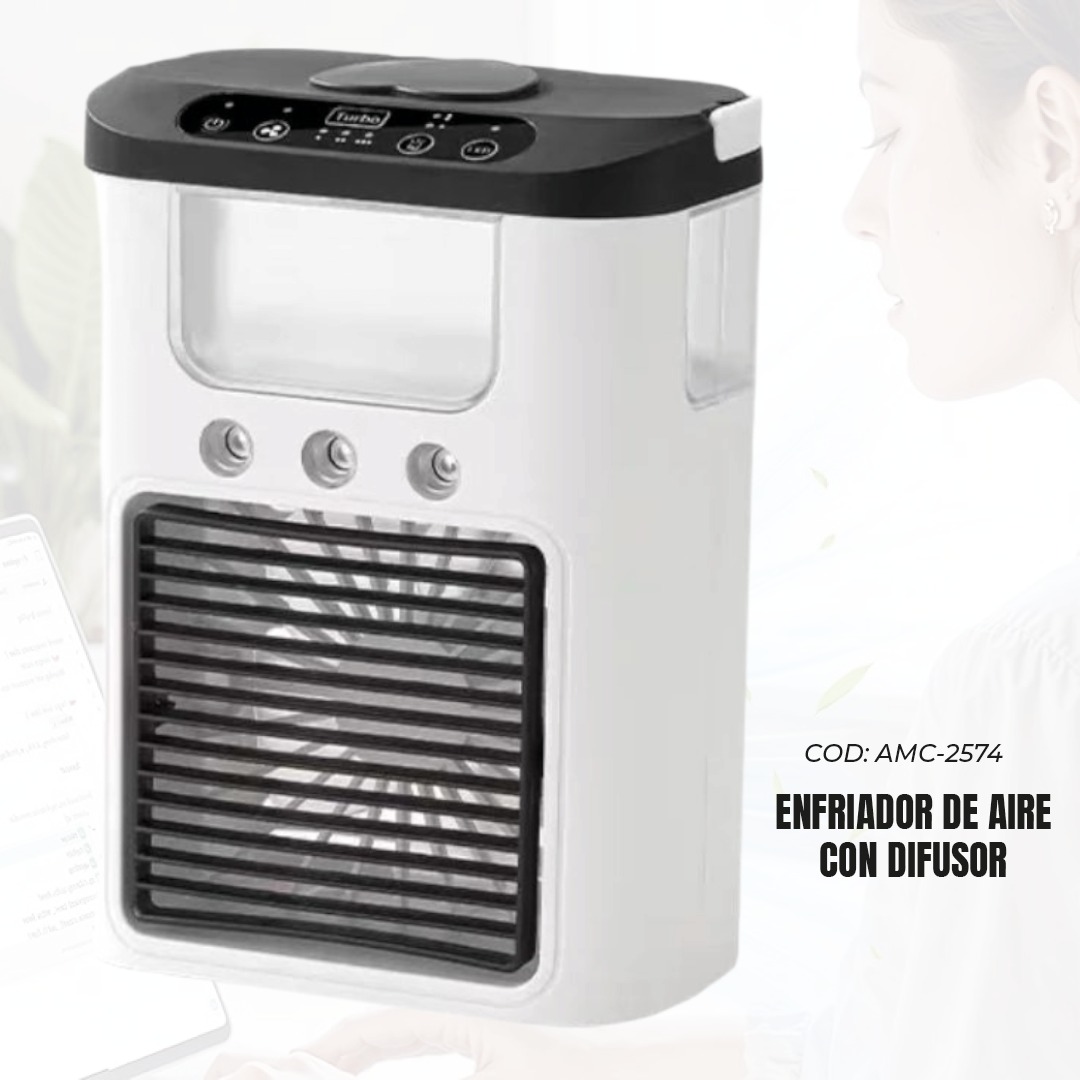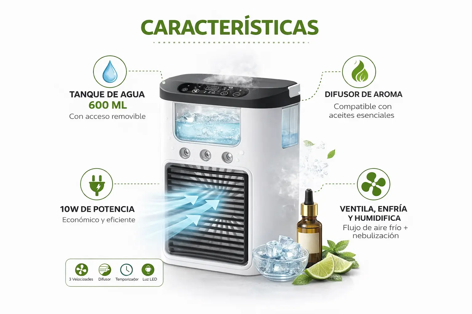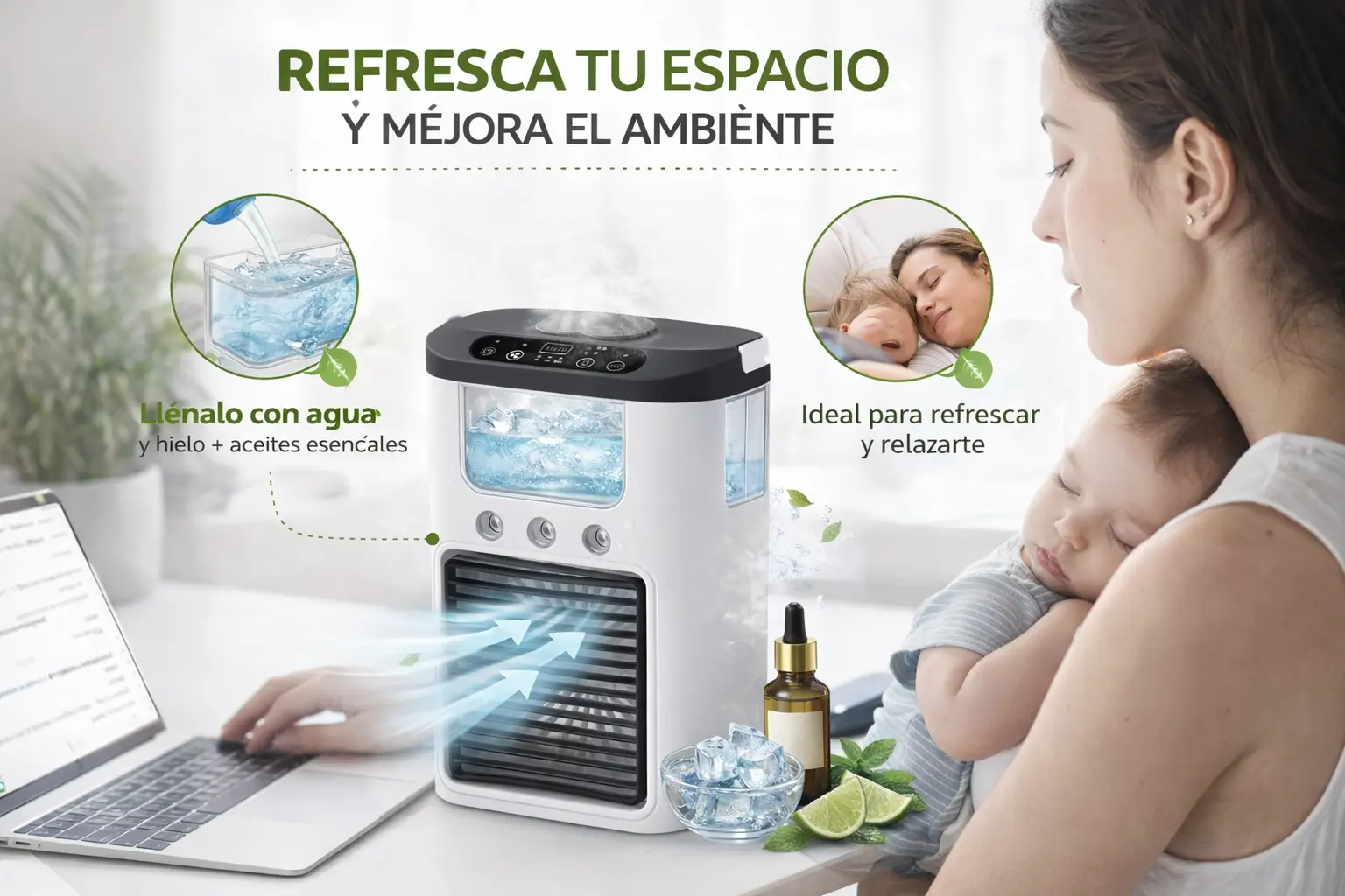El Enfriador de Aire con Difusor refresca el ambiente utilizando aire humidificado, creando una sensación más fresca y agradable sin resecar el aire.