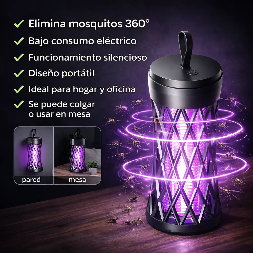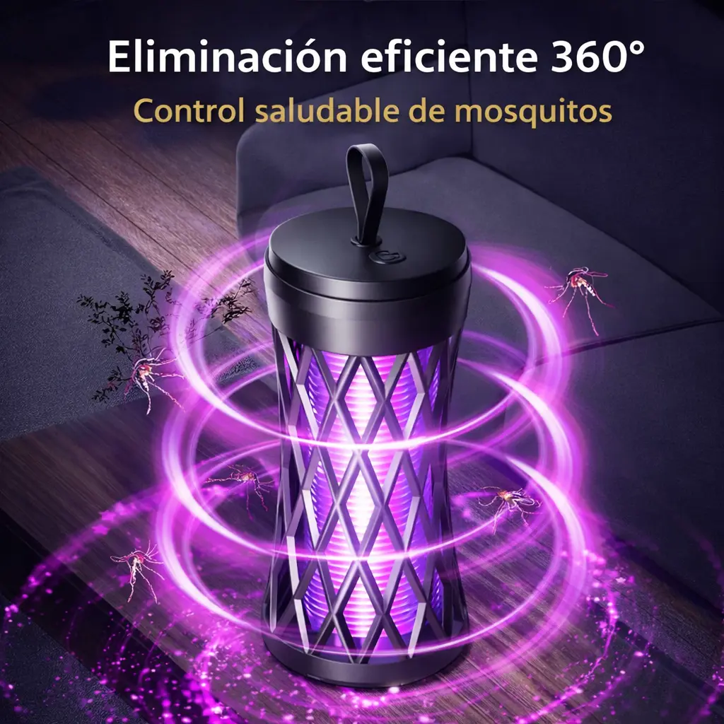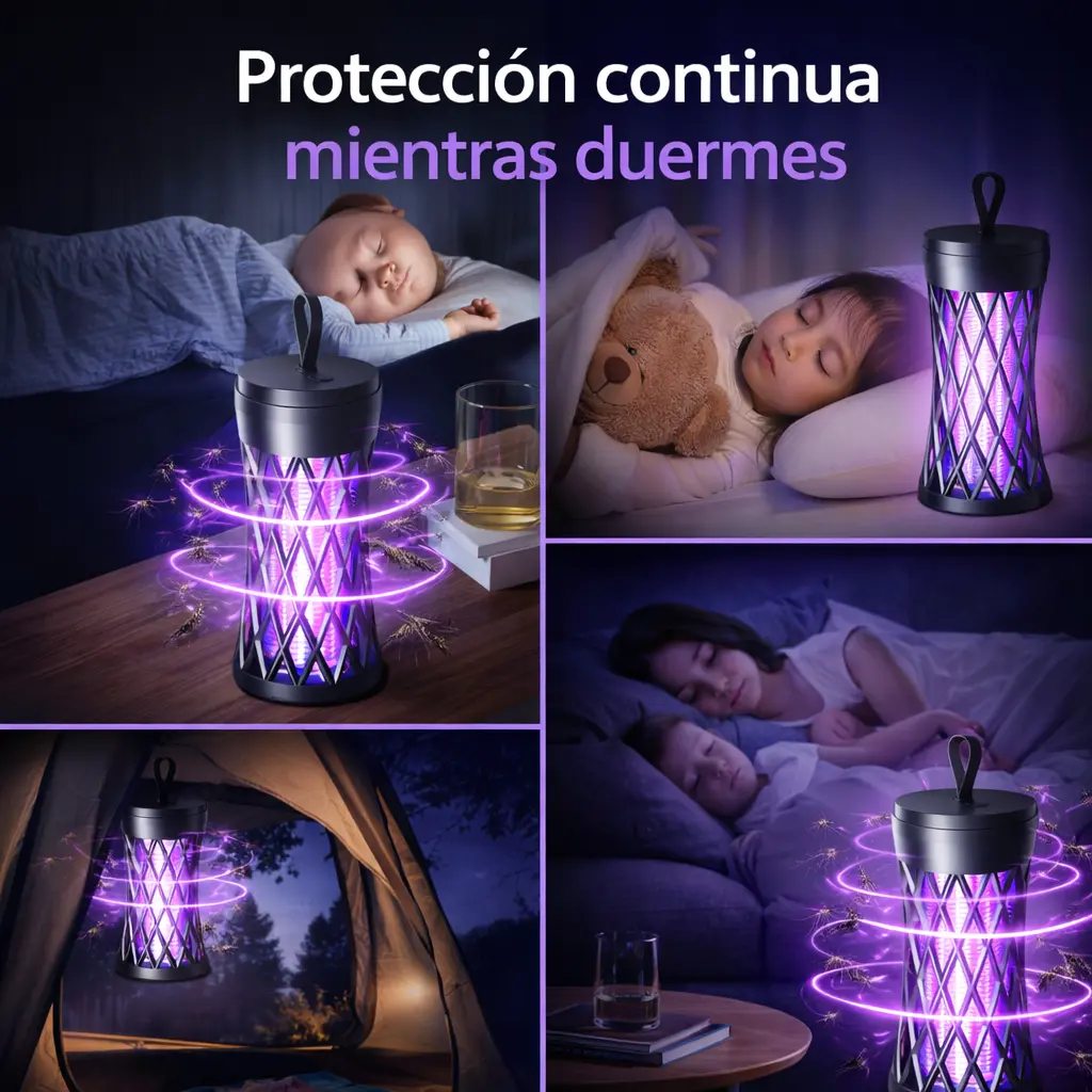 La lámpara atrae los mosquitos mediante luz ultravioleta y los elimina de forma segura, ayudando a mantener espacios libres de insectos molestos mientras duermes, trabajas o descansas sin ruidos ni químicos.