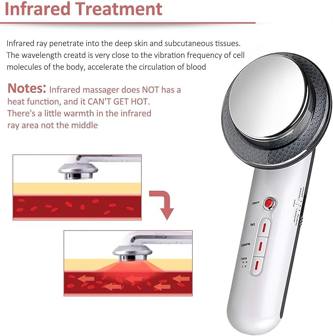 Infrarrojo: La longitud de onda infrarroja de este dispositivo de adelgazamiento ultrasónico es de 8 a 12 μm. Tiene un fuerte poder de penetración para la piel humana y el tejido subcutáneo, penetra en el suelo de la piel, promueve la circulación sanguínea y el metabolismo, mejora la aspereza de la piel y aumenta la elasticidad de la piel.