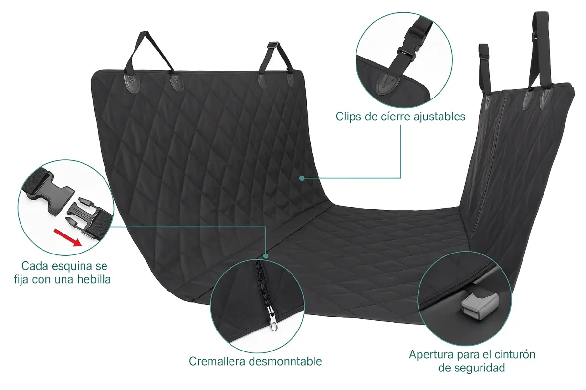 - Diseño Tipo Hamaca: Se ajusta a la parte trasera de tu coche, creando una barrera protectora para que tu perro no caiga al suelo del vehículo durante los frenazos.