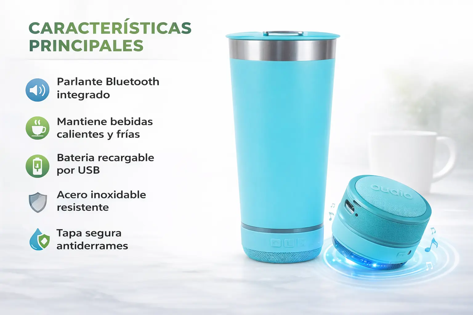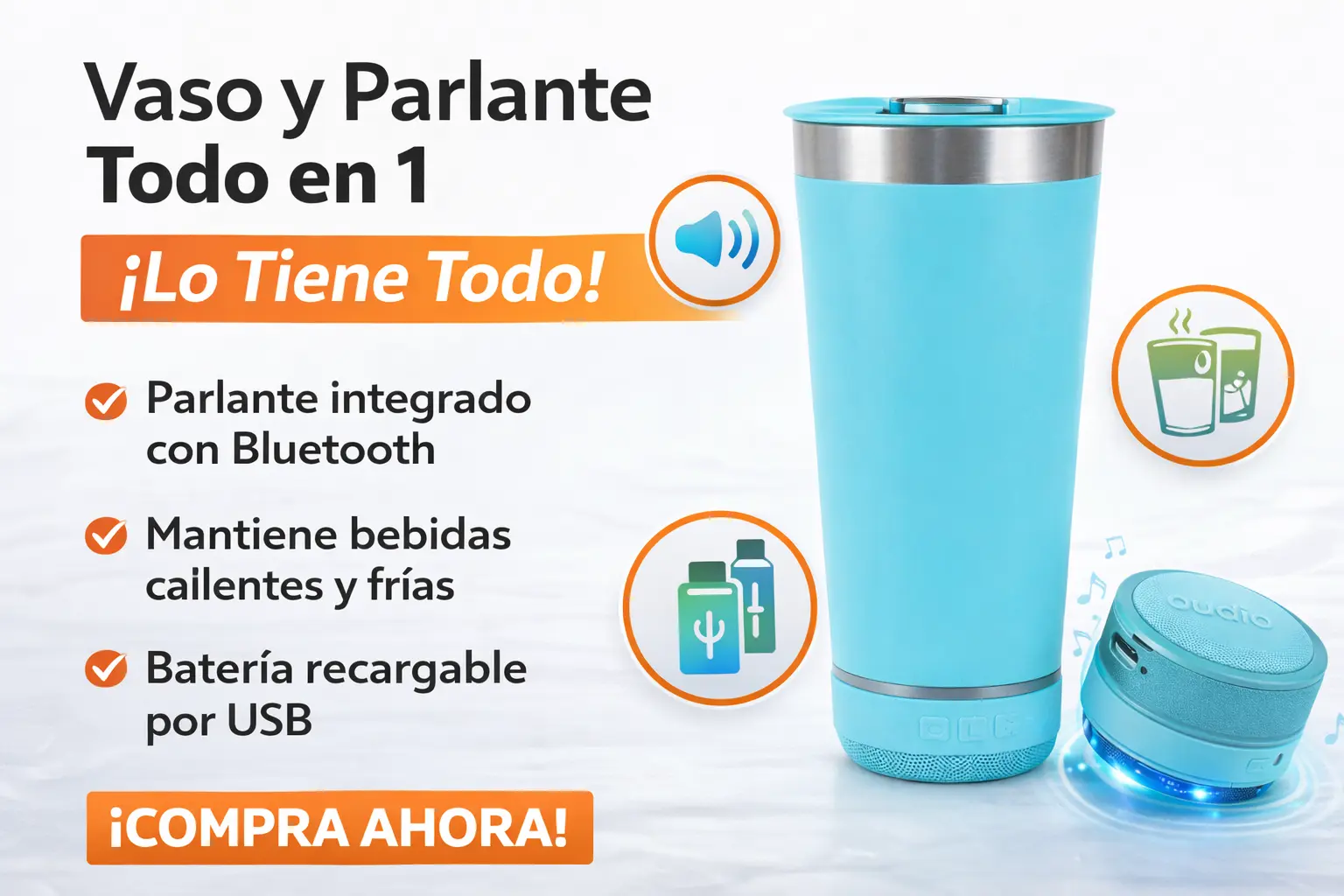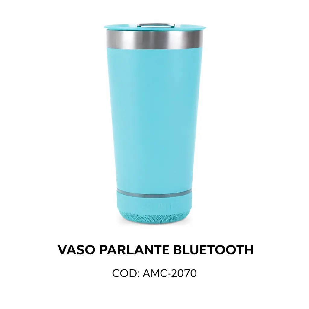El Vaso Parlante Bluetooth te permite disfrutar tu bebida favorita mientras escuchas música, sin necesidad de usar parlantes externos.