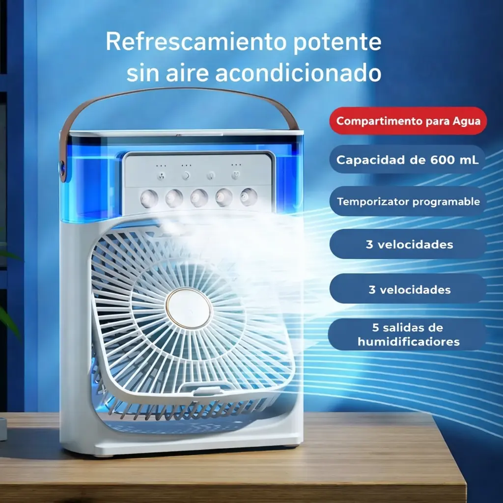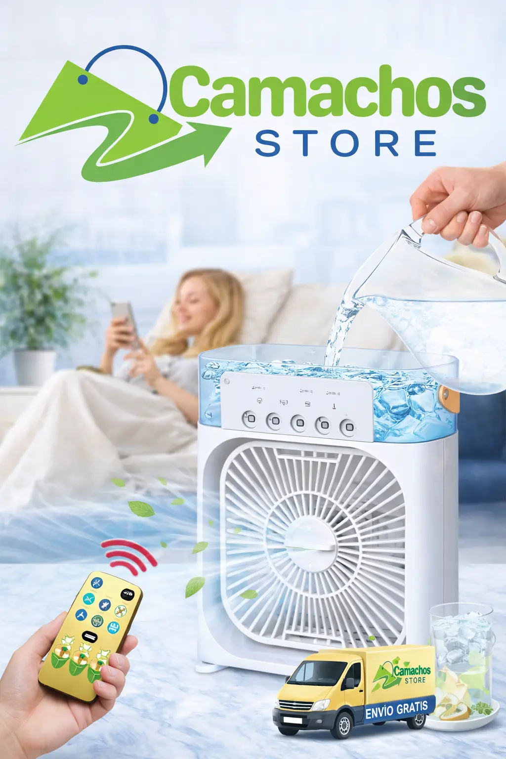 El Ventilador Enfriador Humidificador utiliza agua para generar un aire más fresco y agradable, reduciendo la sensación de calor sin resecar el ambiente.